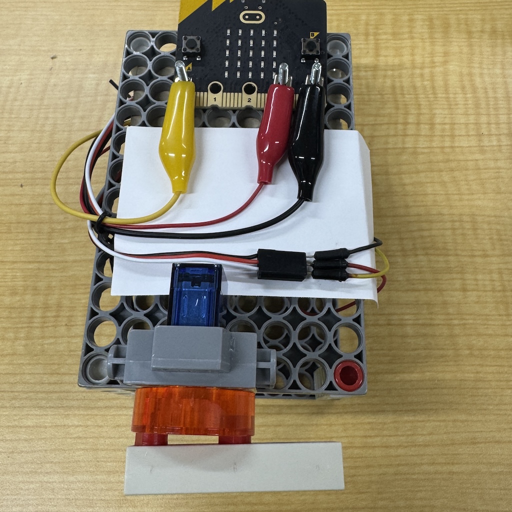 | P0端子(黄色)にサーボモータの白色を,3V端子(赤色)にサーボモータの赤色を,GND端子(黒色)にサーボモータの黒色をつないだ例 | ![]() |